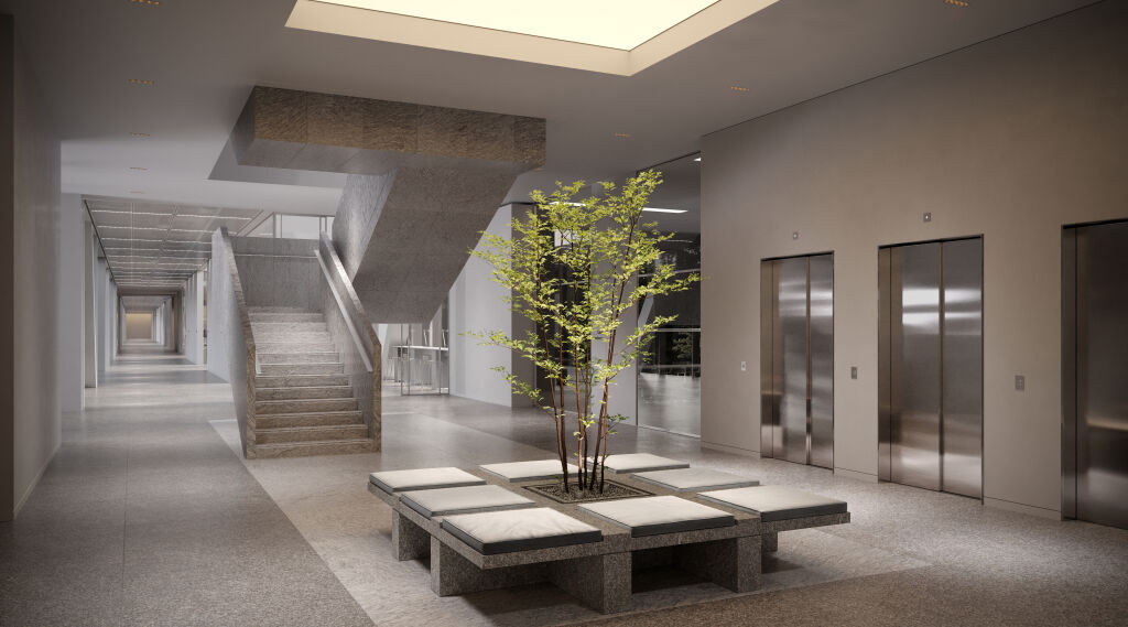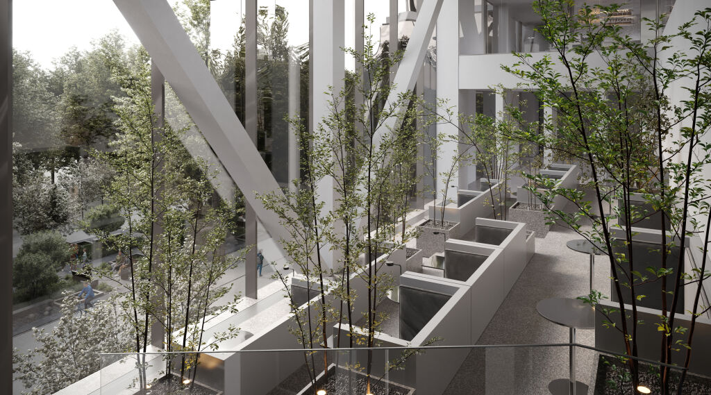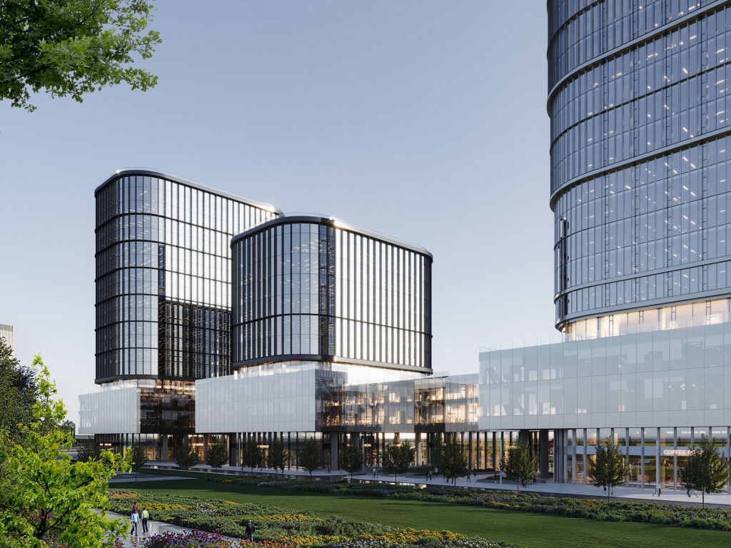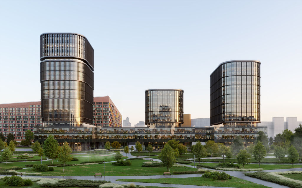 Архитектурную концепцию проекта разработало бюро Kleinewelt Аrchitekten. Чистая и стройная структура здания будет гармонично вписана в зеленый ландшафт прилегающего парка. Фасады из стекла и металла украсят динамичные ламели, а полукруглая форма башен отсылает к форме парка «Ходынское поле». Дизайн-концепция лобби от KEMELIN PARTNERS в натуральных материалах с двусветным пространством, зонами ожидания, стойками ресепшен и лифтовыми холлами объединила комфортную логистику с мультформатной средой: это комфортные бизнес-гостиные с кофе-поинтами, лаунж-зоны для неформального общения и отдыха, переговорные комнаты, а также пространство с амфитеатром, где можно будет устроить кофе-паузу и насладиться умиротворяющим видом на парк Ходынское поле.